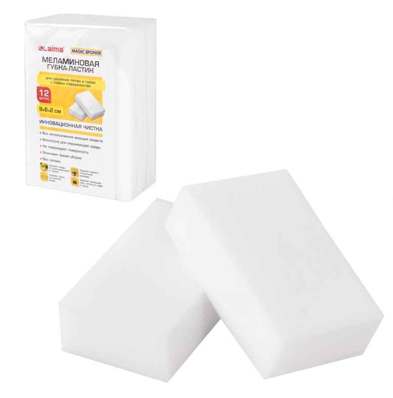 Губка МЕЛАМИНОВАЯ для удаления пятен 9х6х2см, 12шт/уп