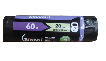 Мешки для мусора: 60л Standart Glionni ПНД, черные, 7мкм, 70*60см, 20шт/рул, 100рул/уп